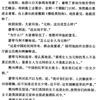 【1961年蒙哥马利元帅访华,观看豫剧《穆桂英挂帅》:怎么让女人当元帅?】蒙哥马利元帅在洛阳观看豫剧《穆桂英挂帅》后,对陪同的中方人员表示“这出戏不好”,“怎么让女人当元帅”,“爱看女人当元帅的男人不是真正的男人”,“女少将有损解放军的声誉”。